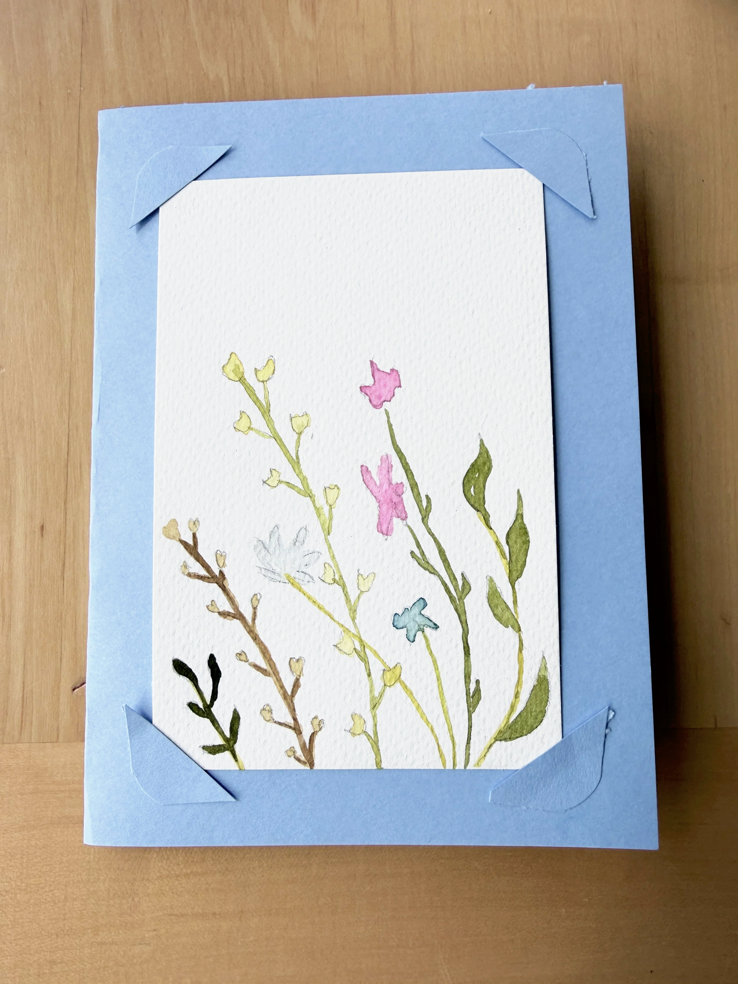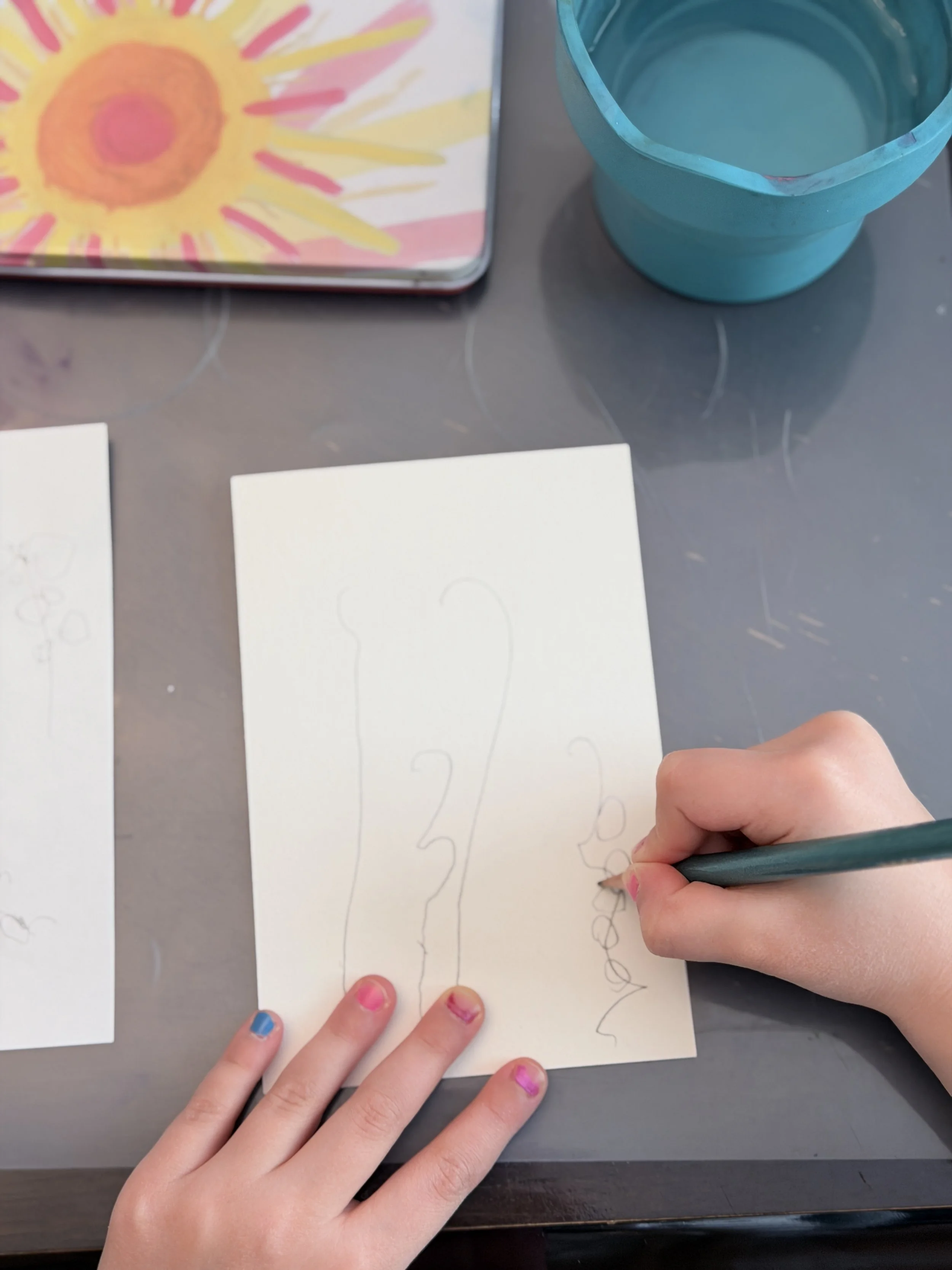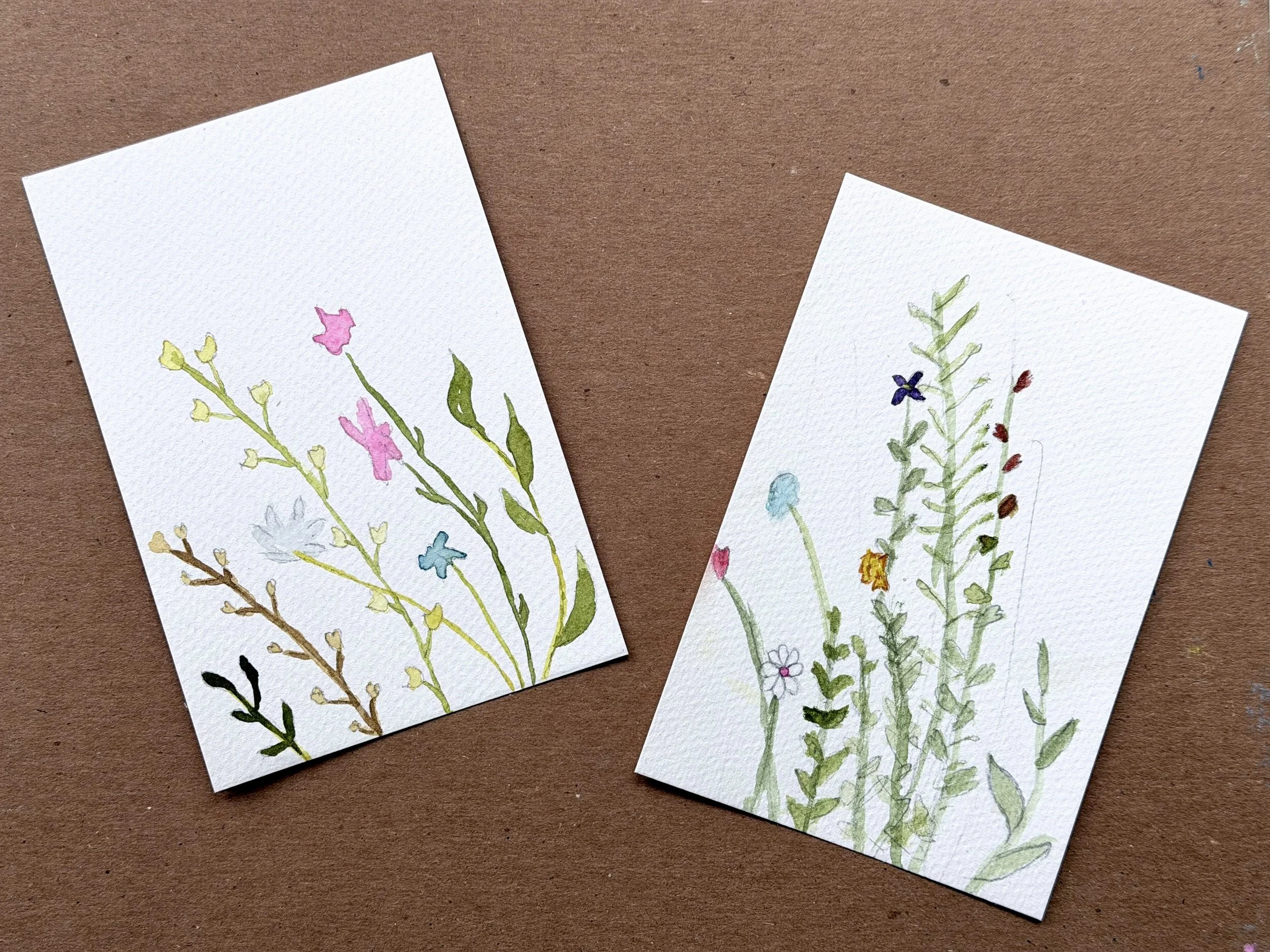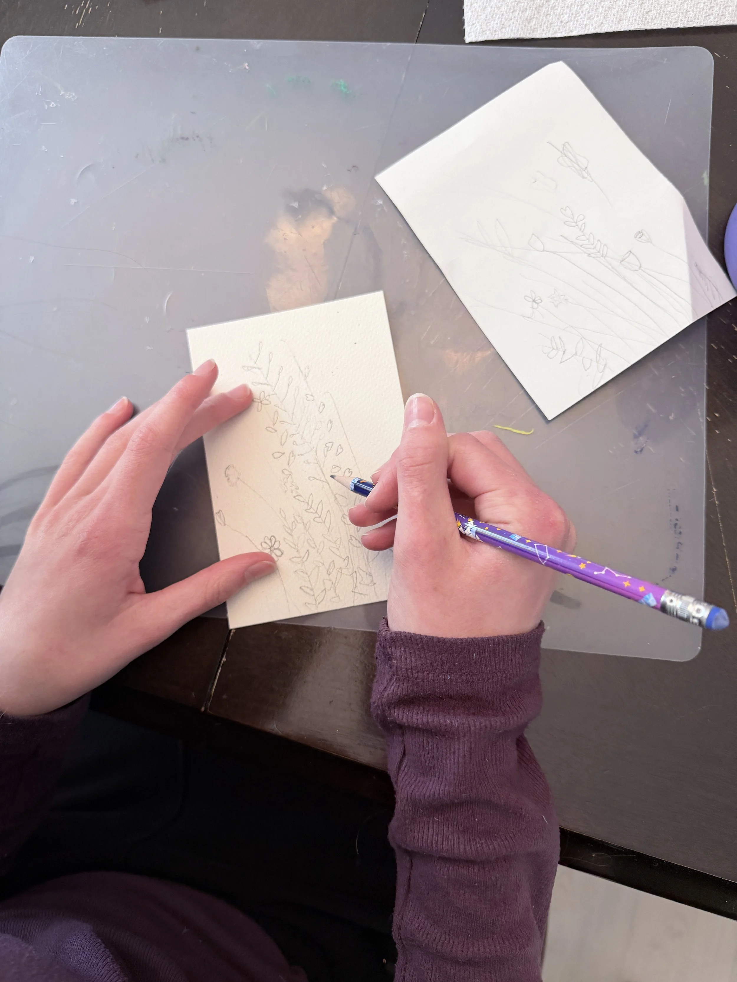 After practicing some different flower shapes, use pencil to lightly draw another version of your wildflowers (it doesn’t have to be an exact copy) onto the piece of watercolor paper. (We highly recommend keeping this painting small, otherwise kids will likely get bored before they finish.)